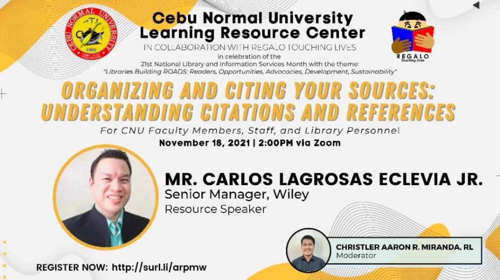 Webinar on: “Organizing and Citing your Sources: Understanding Citations and References” with Mr. Carlos L. Eclevia Jr., Senior Manager, Wiley, as the Resource Person. It is exclusive for CNU Faculty Members, Admin. Staff and LRC Personnel on November 18, 2021 (Thursday) 2:00 PM Via Zoom.