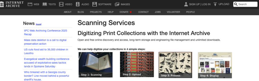 Book Scanning & Lending: Scans books from libraries and makes them available online. Some can be borrowed through its Controlled Digital Lending system, while others are fully downloadable.
