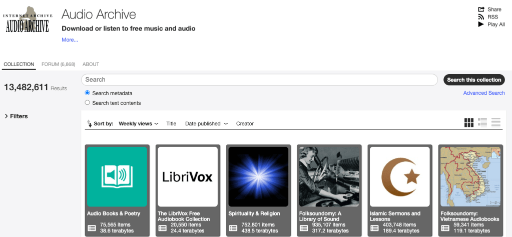 Media Archives: This library contains recordings ranging from alternative news programming, to Grateful Dead concerts, to Old Time Radio shows, to book and poetry readings, to original music uploaded by our users. Many of these audios and MP3s are available for free download. Link: https://archive.org/details/audio